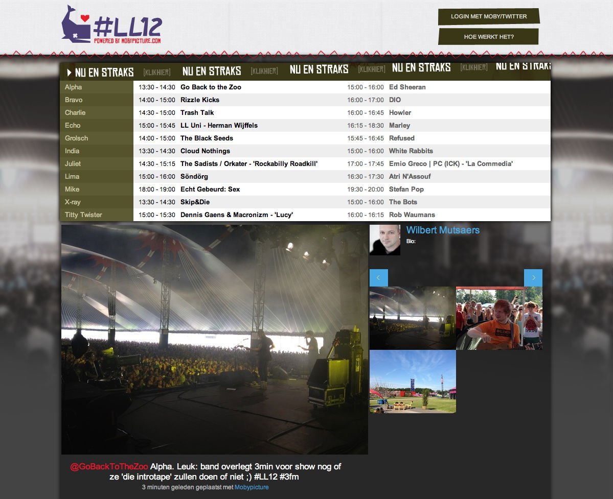 Lowlands is van start! Het MobyNow platform toont realtime wat er nu speelt en zodirect bij je geposte foto! #ll12