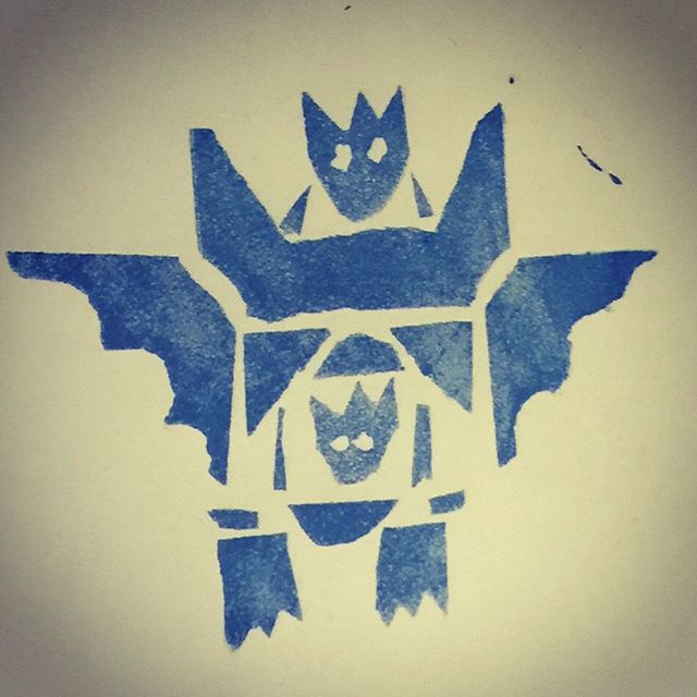 Mika's eerste zeefdruk:"Een vleermuis robot grotmonster draak transformer ei."