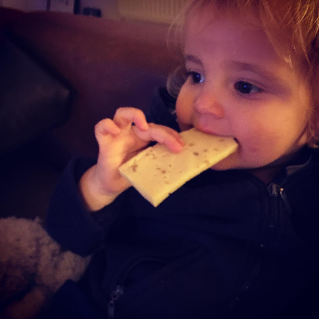 "Eli, wil je een stukje kaas?" "Nee pappa, ik wil grote kaas."