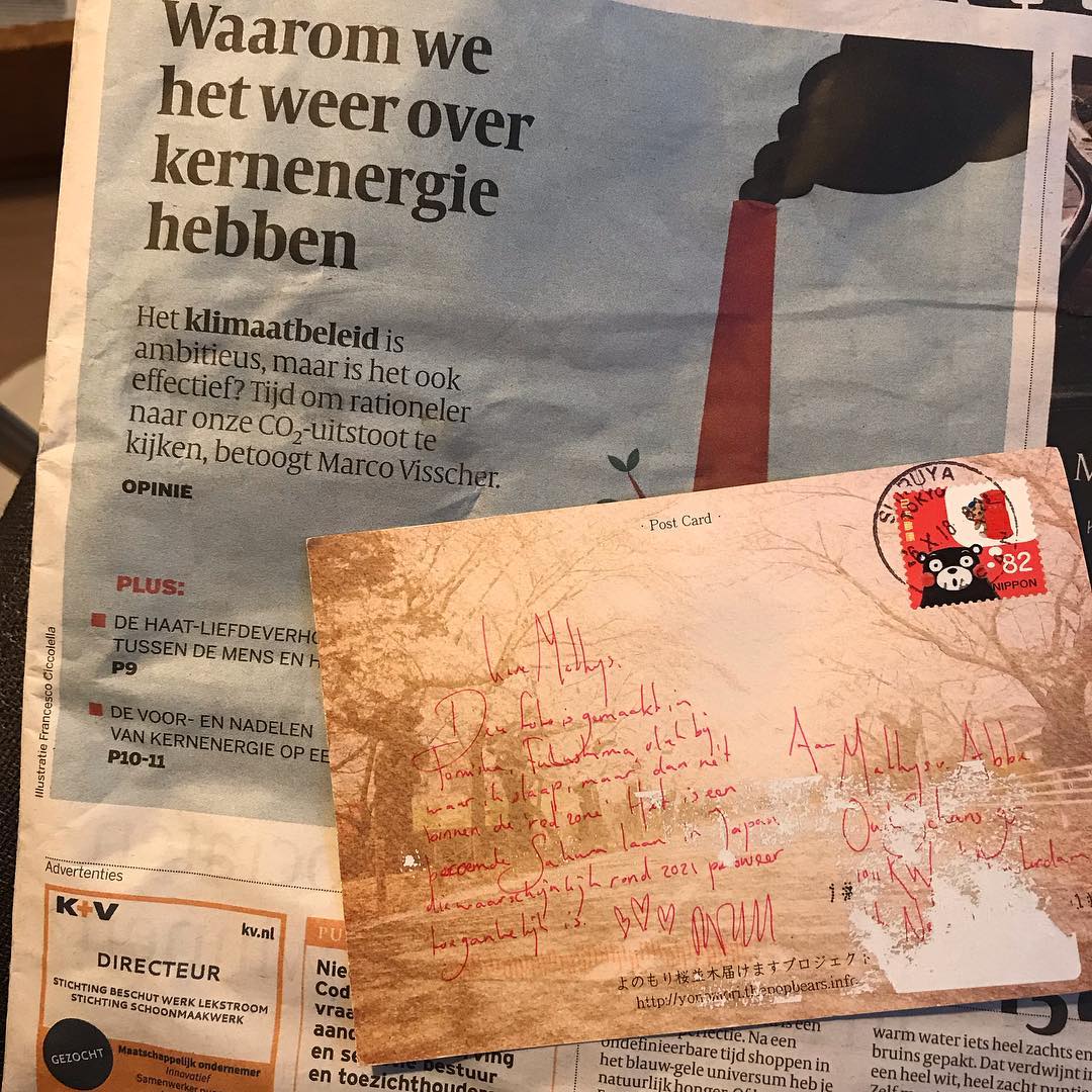 Post uit Fukushima ☢️✉️ “Lieve Mathys,Deze foto is gemaakt in Tomisha, Fukushima vlak bij waar ik slaap maar dan nèt binnen de ’red zone’. Het is een beroemde Sakura laan in Japan die waarschijnlijk in 2021 pas weer toegankelijk is. 💙💙💙 Katinka”