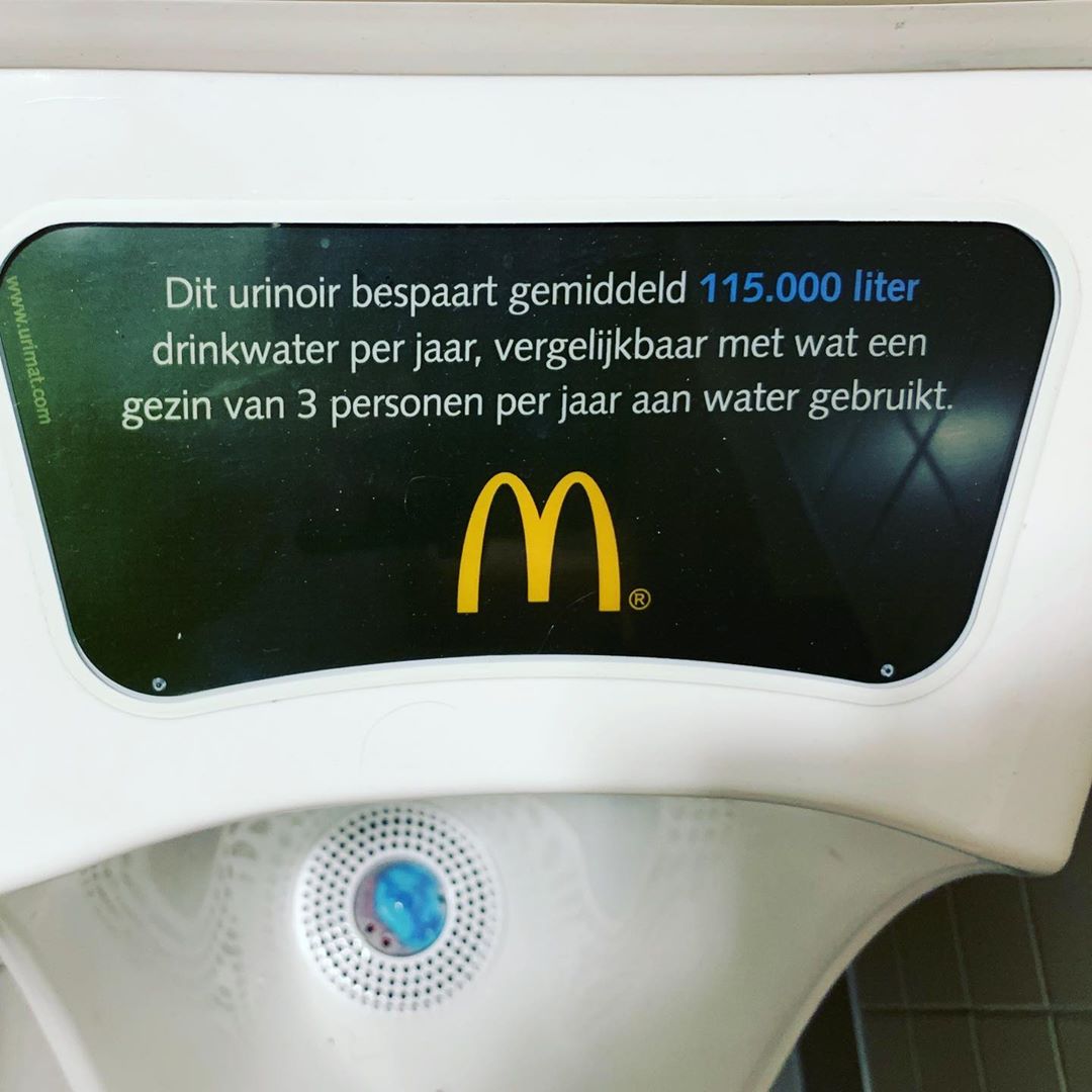 or ‘this urinoir saves 38 burgers a year’ Because one burger needs 3000 liters of water to produce #greenwashing #greennotwashing #waterbullshit #joinkinder