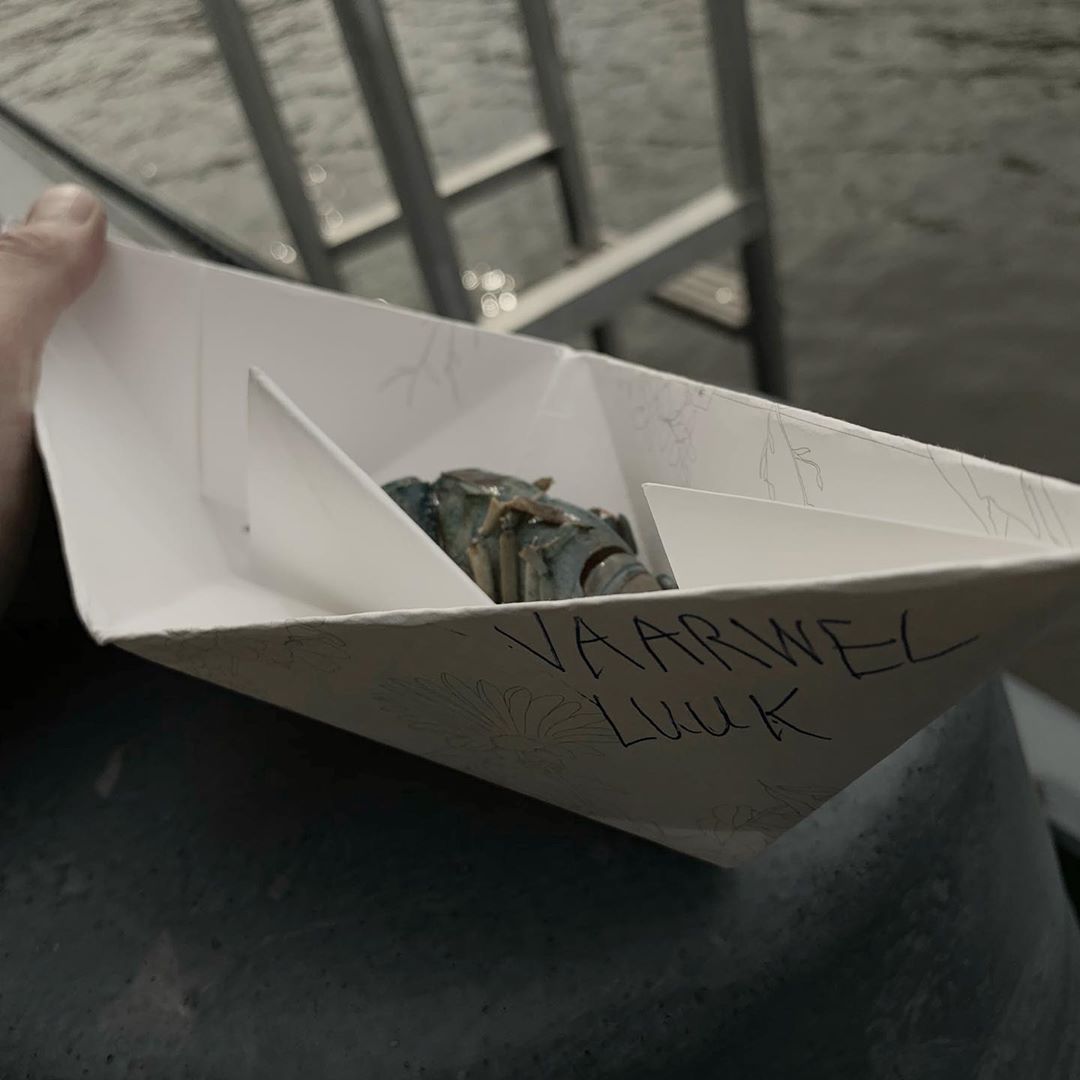 Bon Voyage. After five beautiful years, Mik’s over aged blue lobster has passed away. This ship will bring her to the other side. RIP Luuk. #ceremony