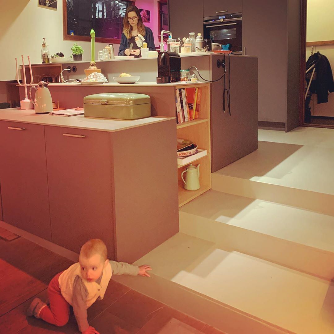 Mia inspecting her new kitchen