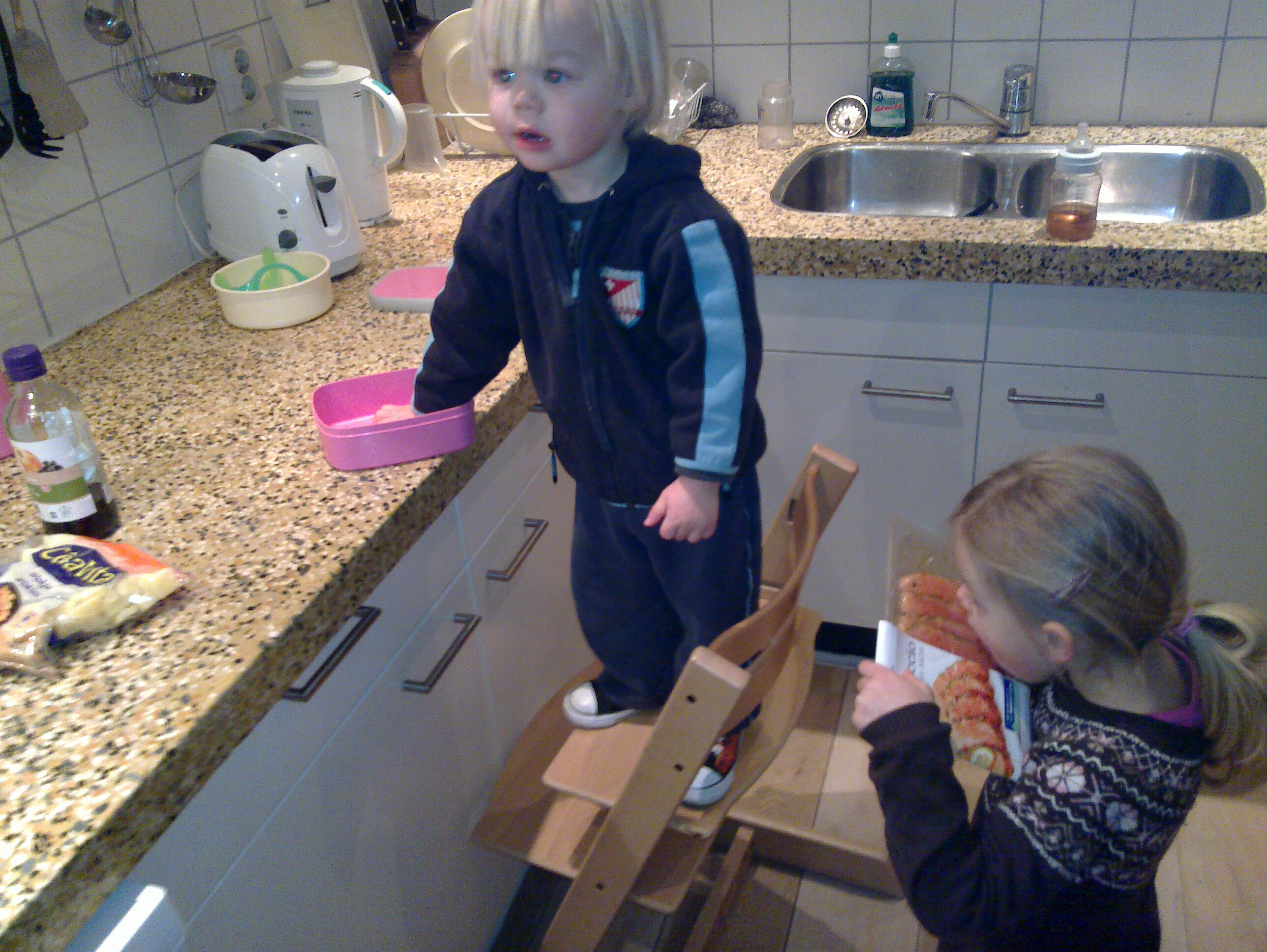 Mika roept Jippies (chips) en Lie likt de nog ingepakte zalm... Honger?