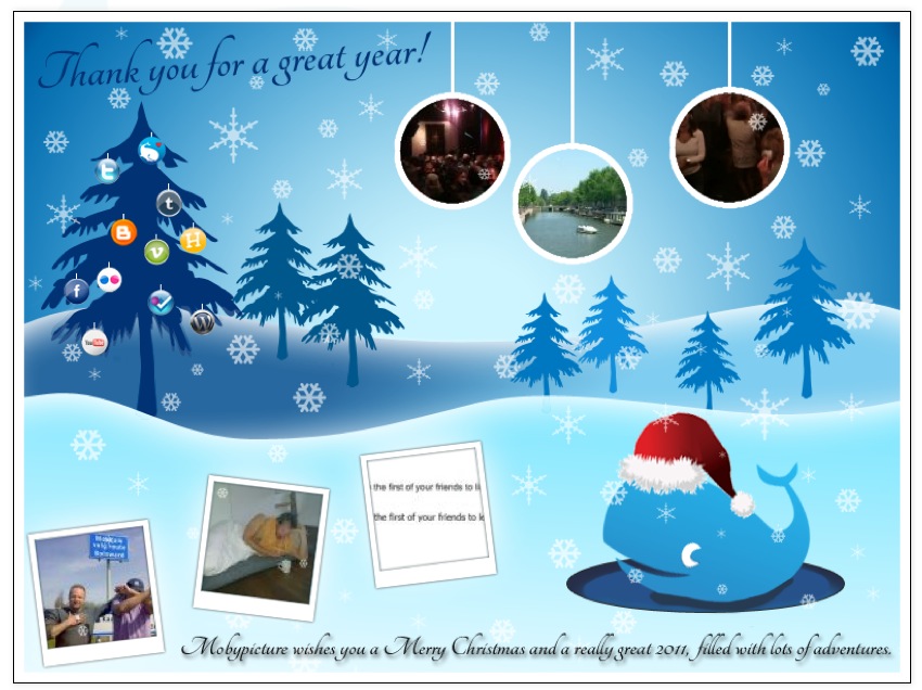 As a surprise to thank you all we decided to make a personalized Christmas Card.As you maybe know we've been working behind the scenes on the next version of Mobypicture.For some features we process the stats of our users shared adventures to make some smart social assumtions and present you and your friends with new insights into these adventures.On e of these features is a algorithm we developed to decide which are your most popular postings of a certain timeframe.This functionality came in handy when we decided to develop the personalized Christmas Card.How it works:When you open the Card web address, we calculate based on view count and amount of comments which were the most interesting postings you've shared in 2010. This algorithm might change over the next few months BTW when we add some new social features to Moby.We present you with the six most interesting postings and on those particular postings we also place a badge.You can watch the Christmas Card of anybody by clicking on the link of their user page BTW. It's fun to see these stats of your friends postings!Try it yourself:gotohttp://www.mobypicture.com/user/username/bestof2010